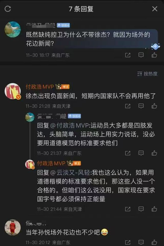 其实在此前男篮集训名单出炉的时候,就有不少球迷讨论为什么郭士强没带在全运会表现出色的徐杰,反而用王岚嵚顶替赵睿。而近期付政浩也回答了球迷这个疑问,因为徐杰出现负面新闻,短期内国家队不会再用他了